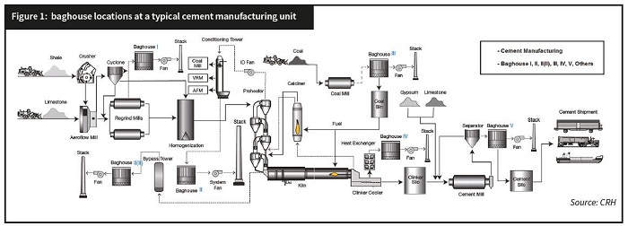 As we know, particulate dust is the main pollutant from the cement industry. According the figure 1, the typical cement manufacturing and baghouse, there are about 6 baghouse parts to control the particulate emission, which include crusher, raw mill and kiln, bypass, coal mill, clinker cooler, cement mill and other parts (belt conveyor, homogenization, package and ship etc.)