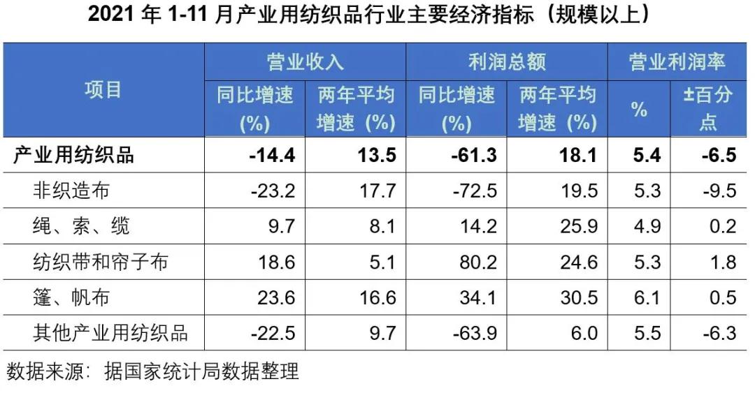 經(jīng)濟效益方面,1-11月產(chǎn)業(yè)用紡織品行業(yè)規(guī)模以上企業(yè)的營業(yè)收入同比下降14.4%,兩年平均增長13.5%,利潤總額同比下降61.3%,兩年平均增長18.1%,營業(yè)利潤率為5.4%,同比下降6.5個百分點。分領(lǐng)域看,非織造布行業(yè)的營業(yè)收入和利潤總額分別同比下降23.2%和72.5%,營業(yè)利潤率為5.3%,較上年同期下降9.5個百分點;繩、索、纜行業(yè)的營業(yè)收入和利潤總額分別同比增長9.7%和14.2%,營業(yè)利潤率為4.9%,同比增加0.2個百分點;紡織帶和簾子布市場延續(xù)了良好的發(fā)展勢頭,營業(yè)收入和利潤總額分別同比增長18.6%和80.2%,營業(yè)利潤率達到5.3%,同比增長1.8個百分點;篷、帆布的營業(yè)收入和利潤總額分別同比增長23.6%和34.1%,6.1%的營業(yè)利潤率為行業(yè)最高;醫(yī)療衛(wèi)生、過濾、土工用紡織品所在的其他產(chǎn)業(yè)用紡織品的營業(yè)收入和利潤總額分別同比下降22.5%和63.9%,營業(yè)利潤率為5.5%,同比下降6.3個百分點。