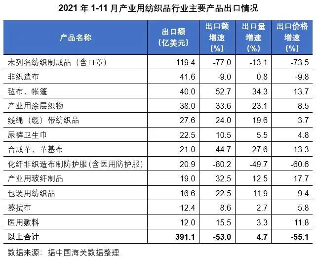 國際貿(mào)易方面,根據(jù)中國海關(guān)數(shù)據(jù),2021年1-11月我國產(chǎn)業(yè)用紡織品主要出口產(chǎn)品(按出口金額排名前十二類產(chǎn)品)的出口額為391.1億美元,同比下降53.0%。分產(chǎn)品來看,未列名紡織制成品(主要為口罩)目前是行業(yè)最大的出口產(chǎn)品,但因國外對口罩需求的大幅回落其出口額已較上年同期下降了77.0%,出口均價同比下降73.5%;氈布/帳篷、產(chǎn)業(yè)用涂層織物等傳統(tǒng)產(chǎn)品的出口額分別同比增長52.7%和33.6%,出口均價分別同比增長13.7%和8.5%;合成革及革基布的出口額同比增長44.7%,出口均價同比增長13.3%。非織造布及相關(guān)制品的出口呈現(xiàn)不同走勢,卷材出口41.6億美元,同比下降9.0%,出口量126.0萬噸,同比小幅上漲0.8%,出口均價同比下滑9.8%;化纖非織造布制防護服(含醫(yī)用防護服)出口20.9億美元,同比下降80.2%,出口均價同比大幅下降60.6%;一次性衛(wèi)生用品出口22.5億美元,同比增長10.5%,出口均價同比增長4.8%。從整體看,價格是影響我國產(chǎn)業(yè)用紡織品出口增速的主要因素。