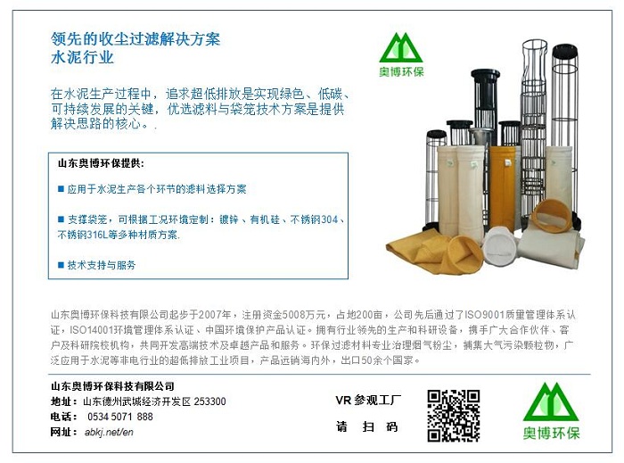 文章詳細分享了超低排放背景下,在水泥行業(yè)的各個生產(chǎn)環(huán)節(jié)(窯頭、窯尾、水泥磨、煤磨等)的煙氣收塵特性,針對性的提出濾料與袋籠的選用技術(shù)。并提出了納米濾料表面處理技術(shù)的發(fā)展趨勢。山東奧博環(huán)保一直走在濾袋和袋籠發(fā)展的最前沿,不僅關(guān)注當下水泥行業(yè)的最新動態(tài),更著眼于幫助水泥等工業(yè)解決未來可能遇到的種種挑戰(zhàn),相信在國內(nèi)外水泥行業(yè)的收塵過濾技術(shù)方面會有更大的提升。