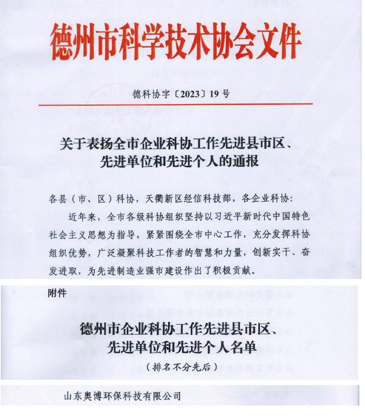山東奧博環(huán)保科技有限公司喜獲得企業(yè)科協(xié)工作“先進單位”榮譽稱號。
