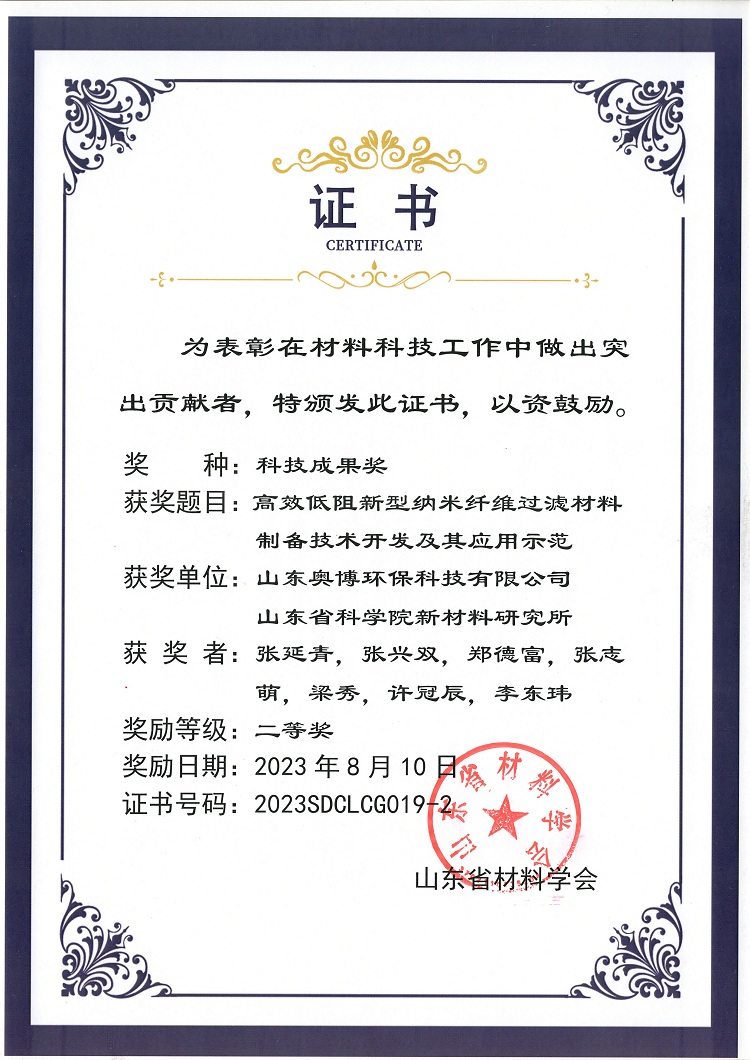 大會(huì)舉行的山東省材料科技成果頒獎(jiǎng)儀式,由山東奧博環(huán)??萍加邢薰九c山東省科學(xué)院新材料研究所,共同研發(fā)的“高效低阻新型納米纖維過濾材料制備技術(shù)開發(fā)及其應(yīng)用示范”項(xiàng)目,以其優(yōu)秀的產(chǎn)品性能,廣泛的應(yīng)用領(lǐng)域及社會(huì)經(jīng)濟(jì)效益,榮獲二等獎(jiǎng)!