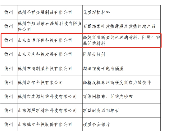 近日,根據(jù)山東省工業(yè)和信息化廳下發(fā)通知,公布2023年度山東省新材料領(lǐng)軍企業(yè)培育庫的入庫名單,山東奧博環(huán)保“高效低阻新型納米過濾材料、阻燃生物基纖維材料”成功入選!