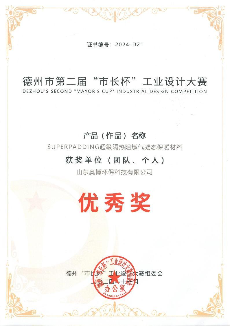 德州市第二屆“市長杯”工業(yè)設(shè)計大賽,旨在推動德州市工業(yè)設(shè)計創(chuàng)新發(fā)展,提升工業(yè)設(shè)計水平,賦能產(chǎn)業(yè)轉(zhuǎn)型升級。山東奧博環(huán)保申報作品《SUPERPADDING超級隔熱阻燃?xì)饽龖B(tài)保暖材料》,榮獲此次市長杯工業(yè)設(shè)計大賽優(yōu)秀獎!
