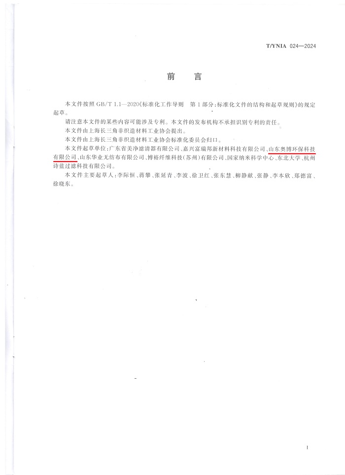 作為國(guó)內(nèi)功能性新材料領(lǐng)域的領(lǐng)先企業(yè),山東奧博環(huán)保科技有限公司參與團(tuán)體標(biāo)準(zhǔn)T/YNIA 024-2024《抗靜電、阻燃納米纖維復(fù)合濾材》的起草與制定工作,標(biāo)志著山東奧博環(huán)保在技術(shù)創(chuàng)新與行業(yè)規(guī)范建設(shè)方面取得雙重突破。